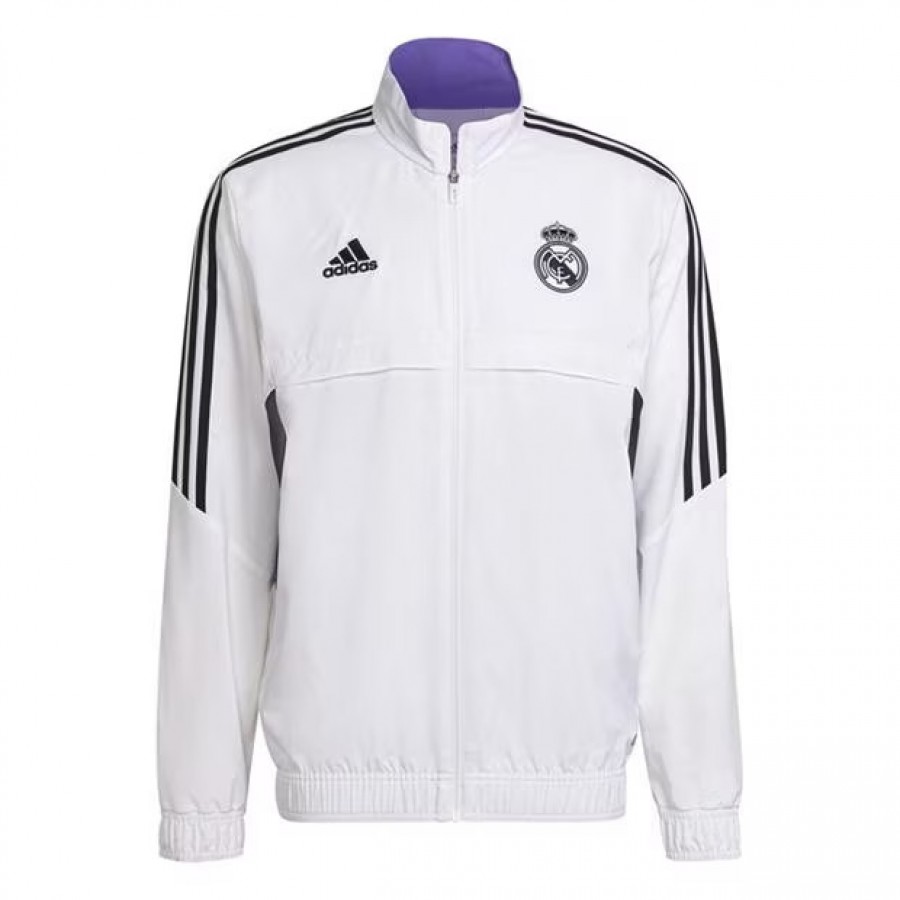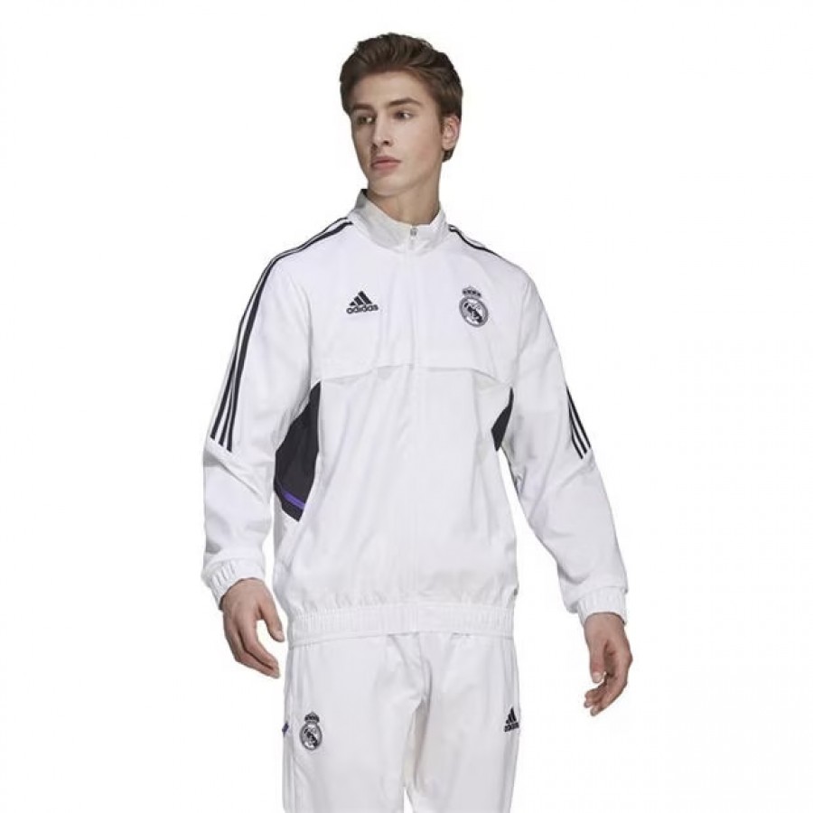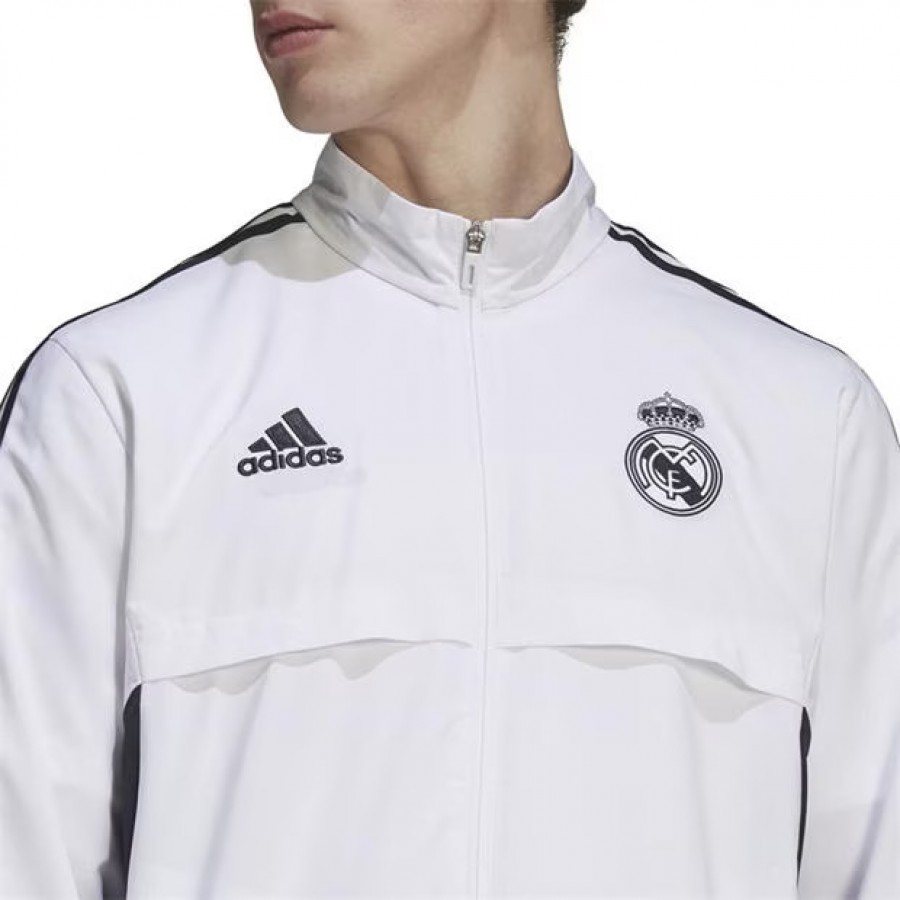 The adidas Real Madrid Mens Presentation Football Jacket White 2023-24 is a must have to keep repping your favourite squad. Featuring two side pockets as a practical touch, the ribbed trims and central zip fastening invite a classic aesthetic. Decorated in a solid block colourway, the piece is finished off with the team badge and adidas branding at either sides of the chest.